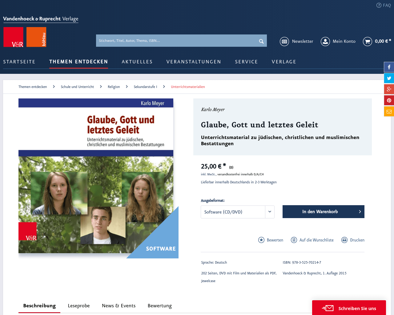 Das sensible thema tod wird häufig grundsätzlich tabuisiert. Diese tendenz kann sich in fremden religiösen kontexten durch unkenntnis sogar noch verstärken. Glaube, gott und letztes geleit. Mit der didaktischen dvd und dem buch „glaube, gott und letztes geleit" wird ein besonderer zugang ermöglicht. Unterrichtsmaterial zu jüdischen, christlichen und muslimischen bestattungen / karlo meyer. Glaube, gott und letztes geleit :